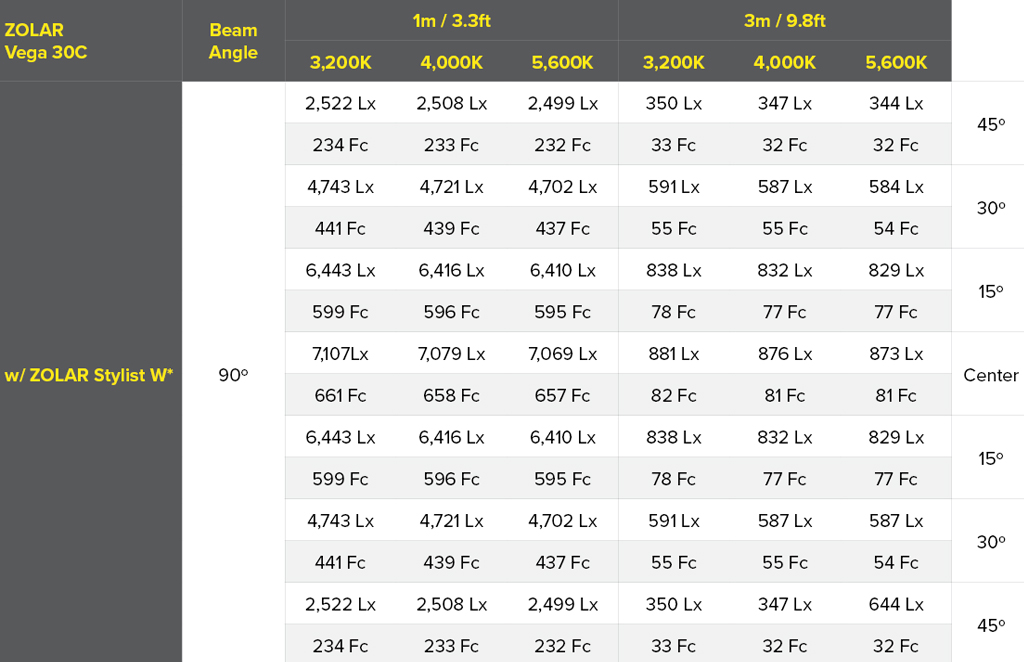Spectral Similarity Index (SSI) is developed by The Academy of Motion Picture Arts and Sciences to evaluate the fidelity of color reproduction particularly for LED light, from a single chip CMOS digital camera point of view. It quantitatively compares the spectrum of the test light with that of a desired reference light source, expressing the similarity as a single number on a scale up to 100. High values indicate a high likelihood of high fidelity color reproduction by most cameras. SSI of ZOLAR® Vega is close to or exceeds 90, across full CCT range (2,000K~20,000K), a leading standard in the industry.